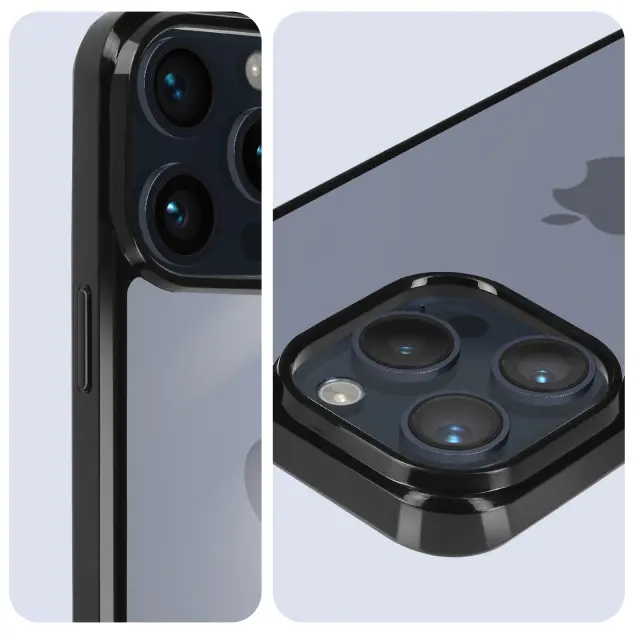 Ovitek Solid Frame za zašcito vašega iPhone 15 Pro Max pred udarci in praskami. Njegova trdna prozorna prevleka s prožnim crnim obrisom poudari dizajn vašega mobilnega telefona. Za vecjo zašcito dvigne robove zaslona in blok kamere.
