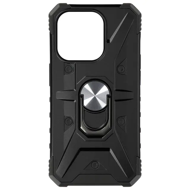 ArmoRing Bump serija črn ovitek iz dveh materialov, posebej zasnovan za vaš iPhone 15 Pro. Trden polikarbonat in na udarce odporen silikon. Vogali odbijača ublažijo nenamerne padce za boljšo zaščito. Dvignjeni robovi na kameri in zaslonu za preprečevanje prask.