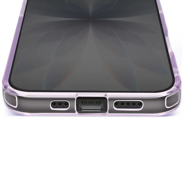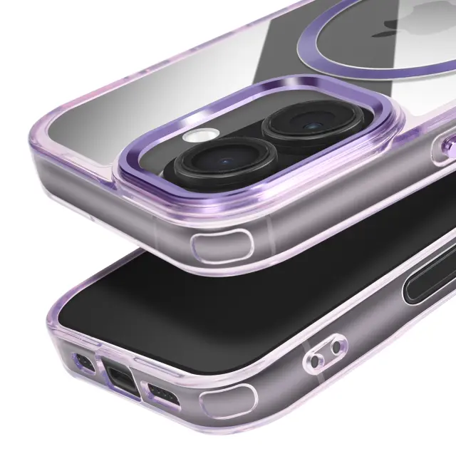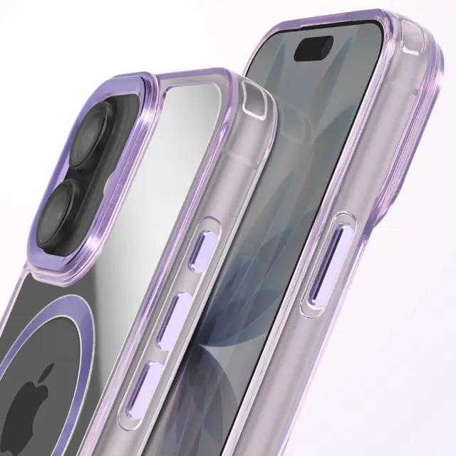 Hibridna struktura s togim hrbtom in mehkimi robovi, odpornimi na udarce. Združljiv s tehnologijo MagSafe za hitro polnjenje in stabilno magnetno pritrditev. Obdelava proti rumenenju za dolgotrajno prozornost. Dvignjen okvir kamere in gumbi s kovinskim učinkom.