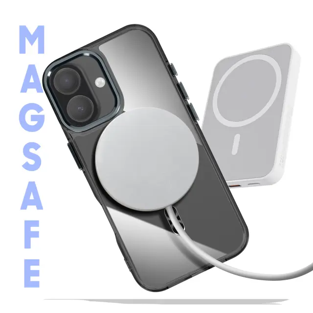 Hibridna struktura s togim hrbtom in mehkimi robovi, odpornimi na udarce. Združljiv s tehnologijo MagSafe za hitro polnjenje in stabilno magnetno pritrditev. Obdelava proti rumenenju za dolgotrajno prozornost. Dvignjen okvir kamere in gumbi s kovinskim učinkom.