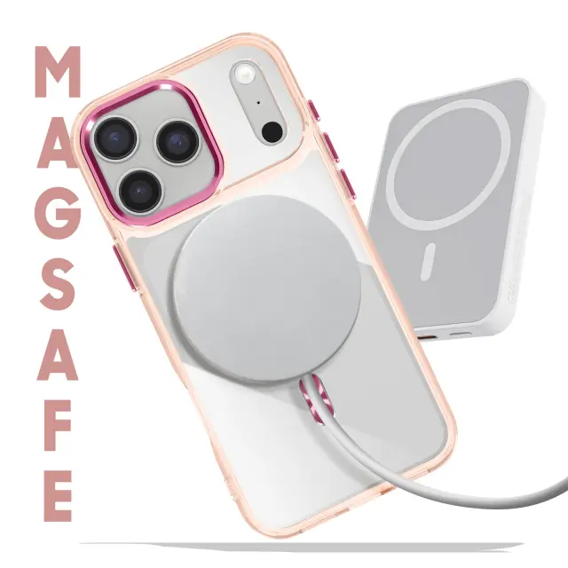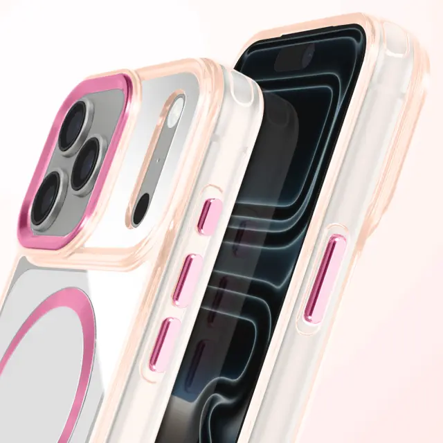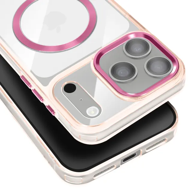 Hibridna struktura s togim hrbtiščem in mehkimi robovi, odpornimi na udarce. Združljiv s sistemom MagSafe za hitro polnjenje in stabilno magnetno pritrditev. Obdelava proti rumenenju za dolgotrajno prozornost. Dvignjen okvir kamere in gumbi s kovinskim učinkom.