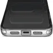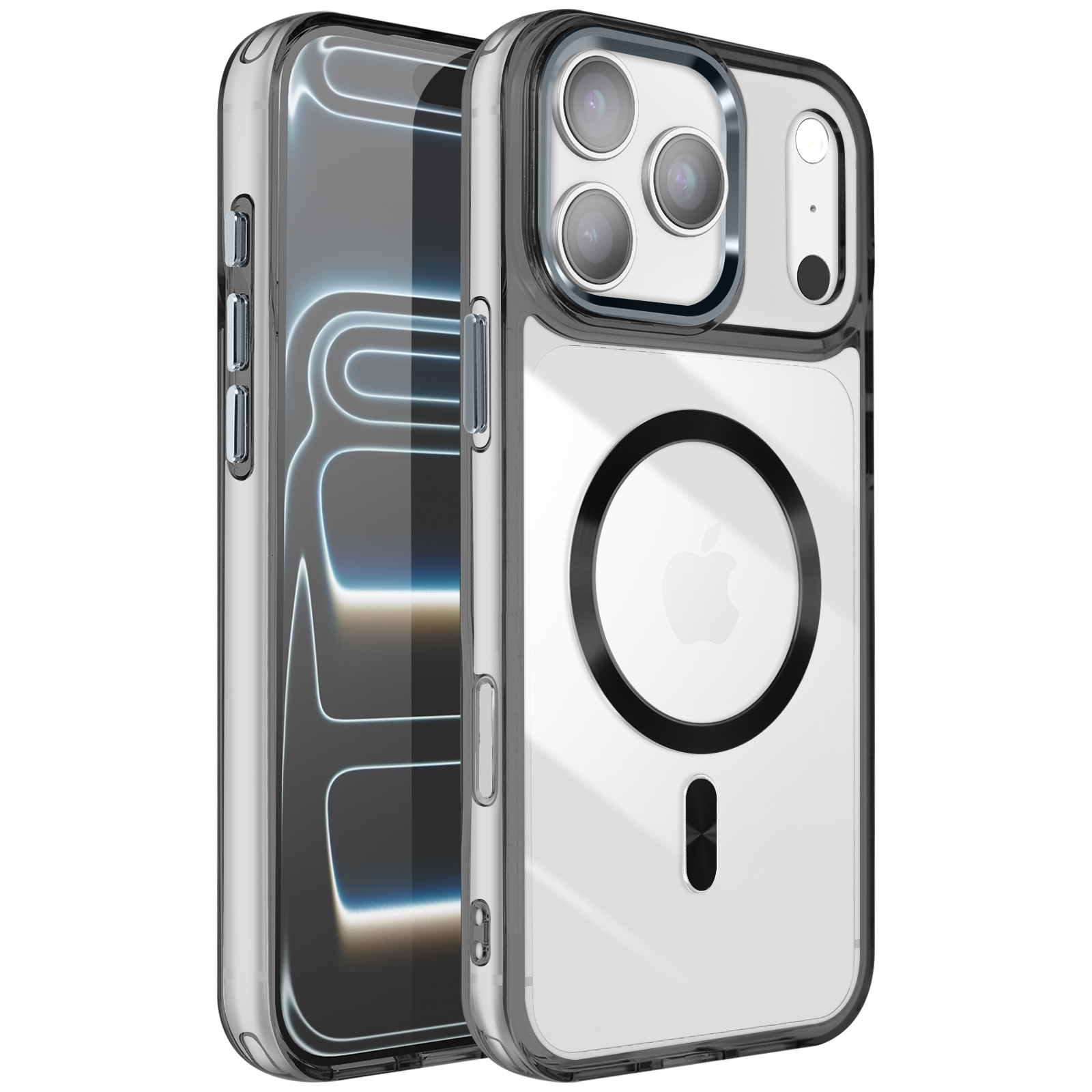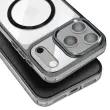 Hibridna struktura s togim hrbtiščem in mehkimi robovi, odpornimi na udarce. Združljiv s sistemom MagSafe za hitro polnjenje in stabilno magnetno pritrditev. Obdelava proti rumenenju za dolgotrajno prozornost. Dvignjen okvir kamere in gumbi s kovinskim učinkom.