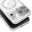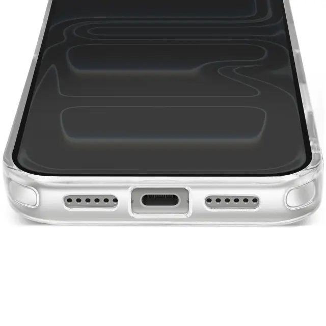 Hibridna struktura s togim hrbtiščem in mehkimi robovi, odpornimi na udarce. Združljiv s sistemom MagSafe za hitro polnjenje in stabilno magnetno pritrditev. Obdelava proti rumenenju za dolgotrajno prozornost. Dvignjen okvir kamere in gumbi s kovinskim učinkom.