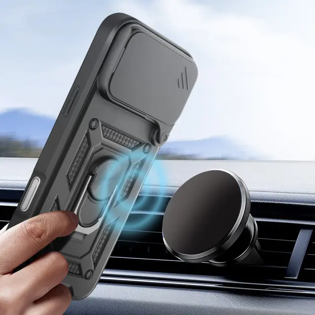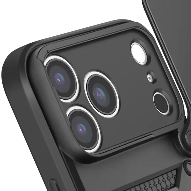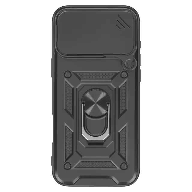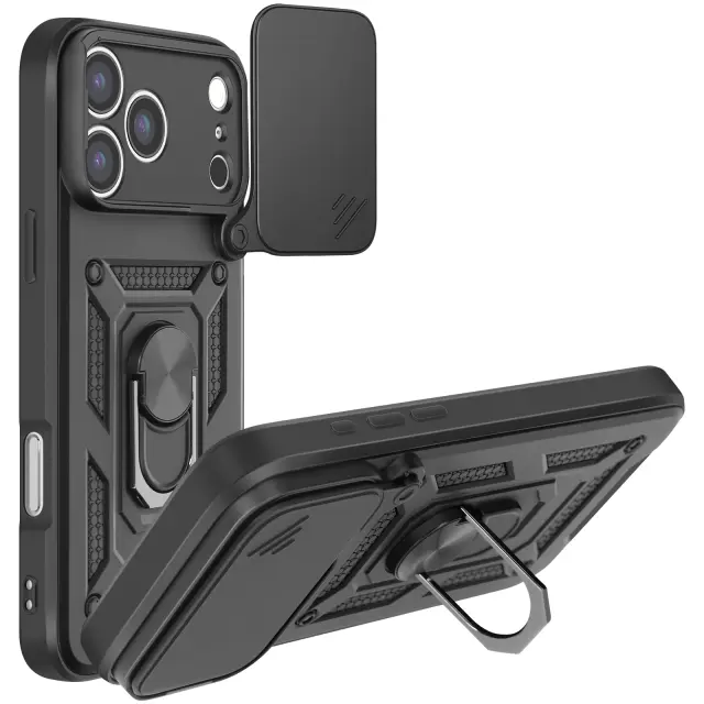 Ovitek za iPhone 17 Pro Max z obročastim stojalom in drsnim pokrovom kamere, Črna