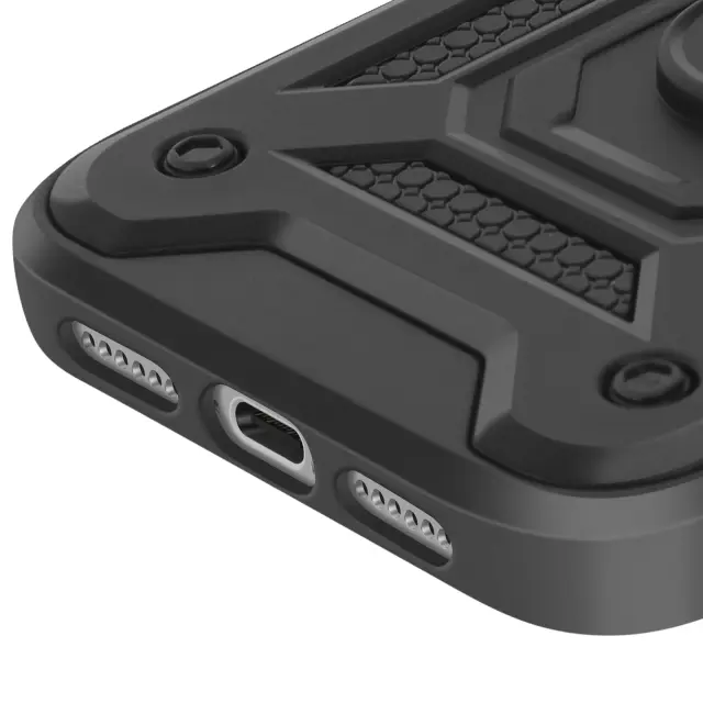 Okrepljena zaščita pred udarci in padci s certifikatom MIL-STD-810G. Drsni pokrov kamere za zaščito objektivov pred praskami. Vgrajen vrtljiv obroč za trden oprijem in praktično držalo za videoposnetke. Zadnja kovinska plošča je združljiva z magnetnim nosilcem za avto.