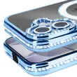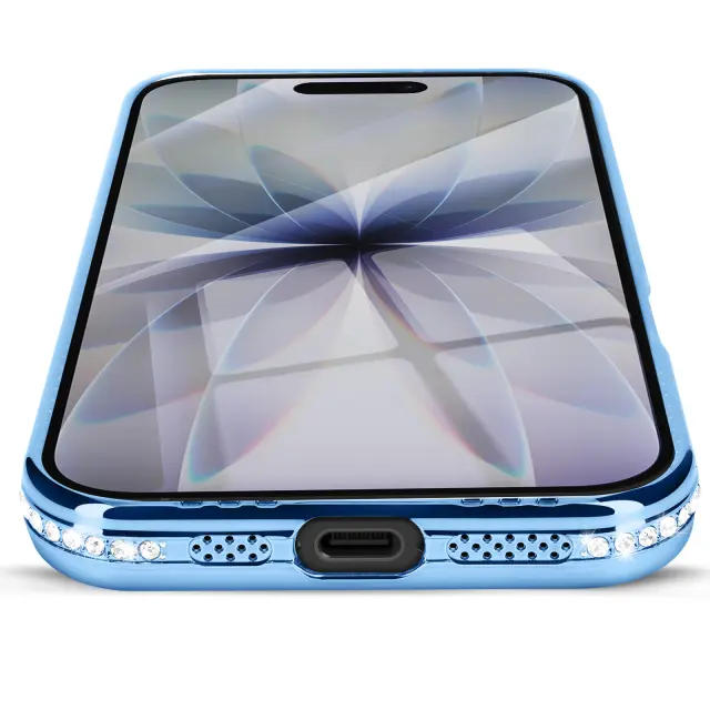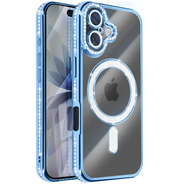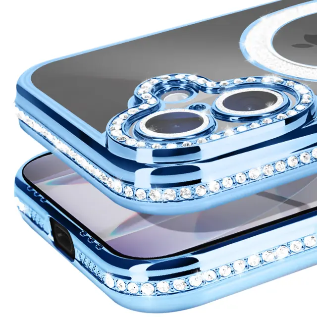 Ovitek za iPhone 17, združljiv z MagSafe, z okrasnim obodom iz kristalov, Svetlo modra