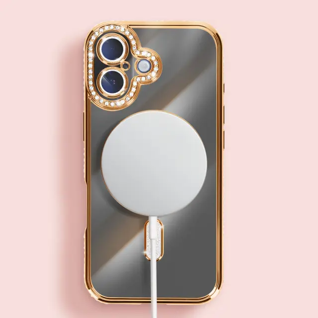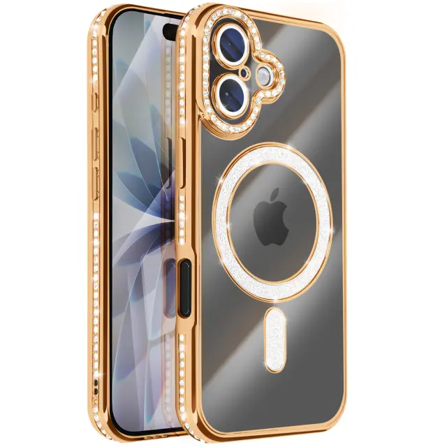 Ovitek za iPhone 17, združljiv z MagSafe, z okrasnim obodom iz kristalov, Zlata