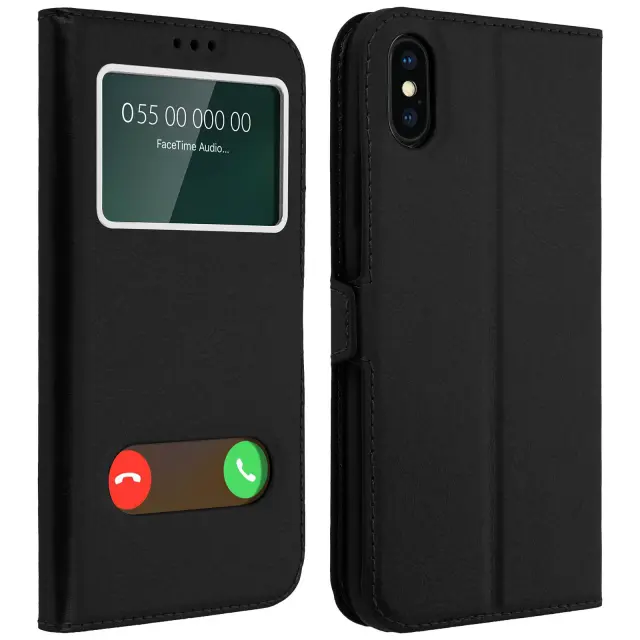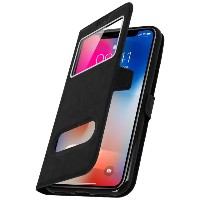 Zaščitna torbica z dvojnim oknom, zasnovana za Apple iPhone X in XS. Prikaz okna za obvestila in čas. Odprtina za hitro sprostitev. Funkcija vodoravnega stojala za udobno gledanje videoposnetkov.
