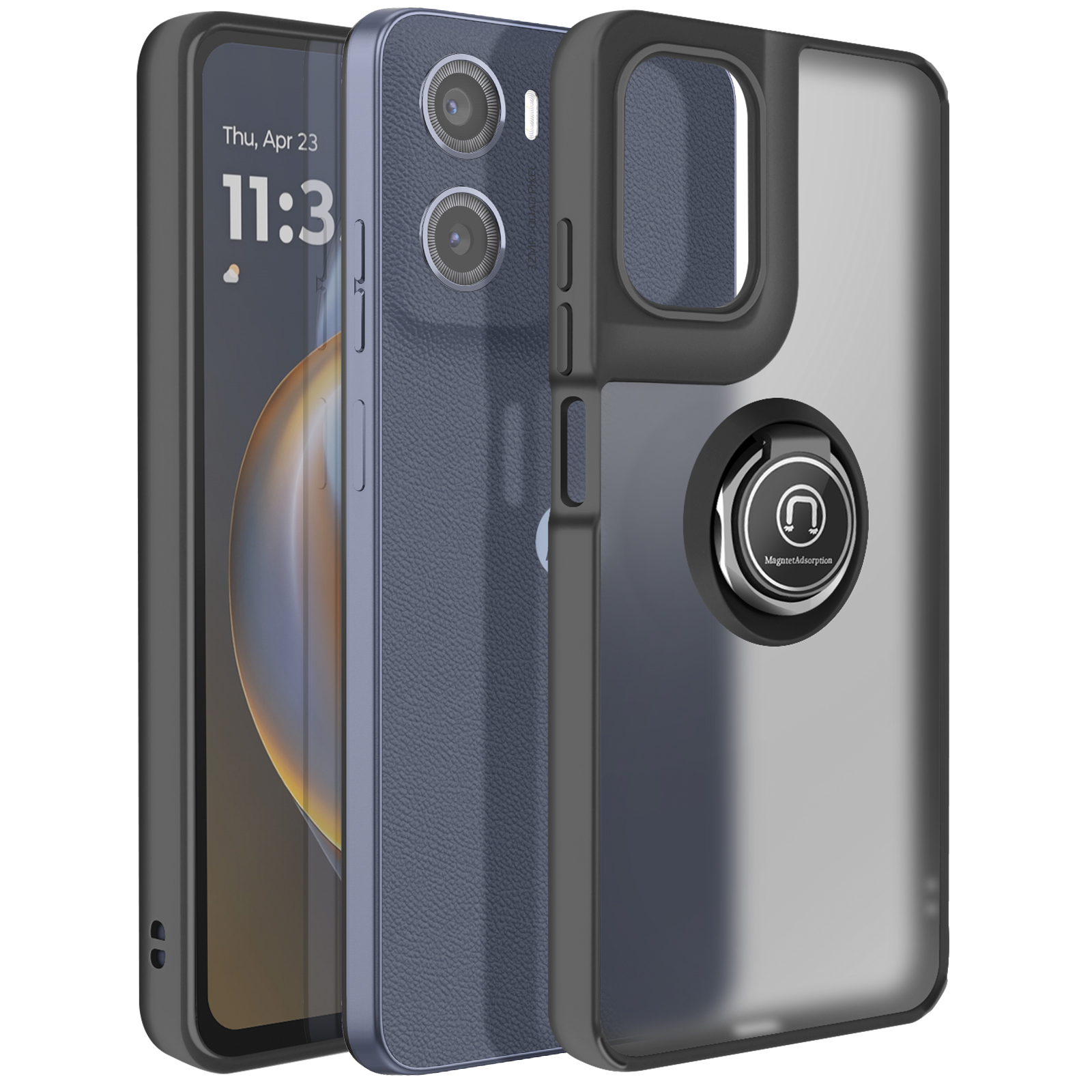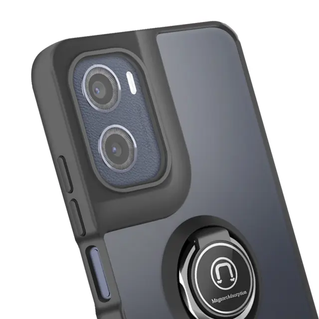 To ohišje za Motorolo Moto E15/G05 ima trdno hrbtno stran iz matiranega polikarbonata z mat površino, ki je odporna na praske in sledi.. Mat črn okvir TPU absorbira udarce v vogalih in trdno drži pametni telefon na mestu. Kovinski vrtljivi obroč se vrti za 360° in napravo stabilizira v vodoravnem položaju za gledanje ali video klice.. Zaradi feromagnetnega vložka v obroču je ohišje združljivo z magnetnimi nosilci za avtomobile..