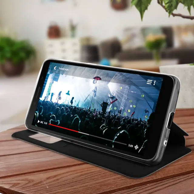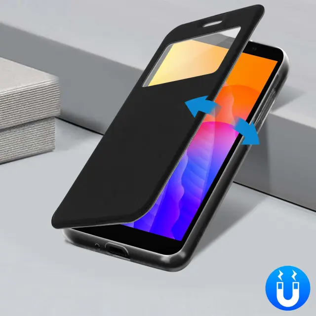 Ovitek za okno Huawei Y5p z držalom za kartico in stojalom za video - crn
