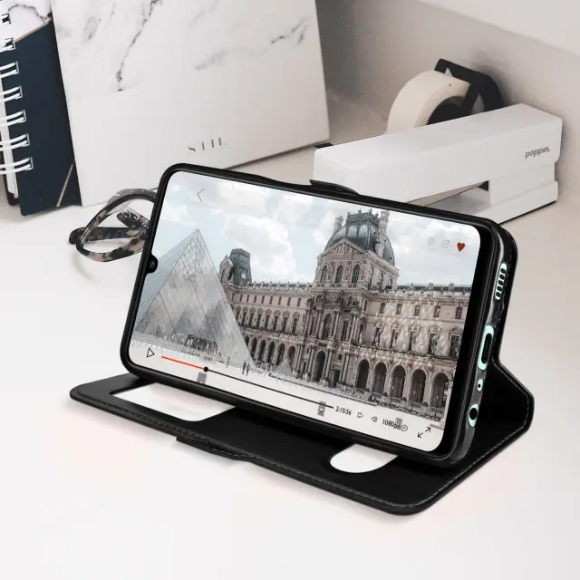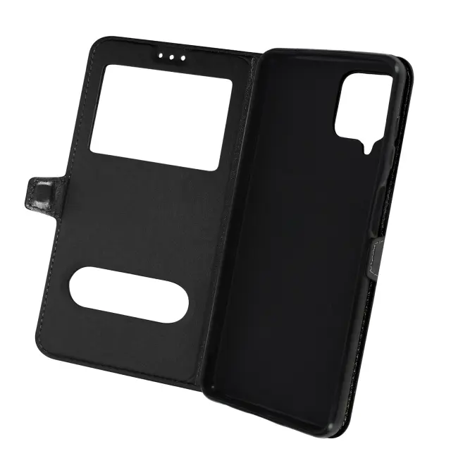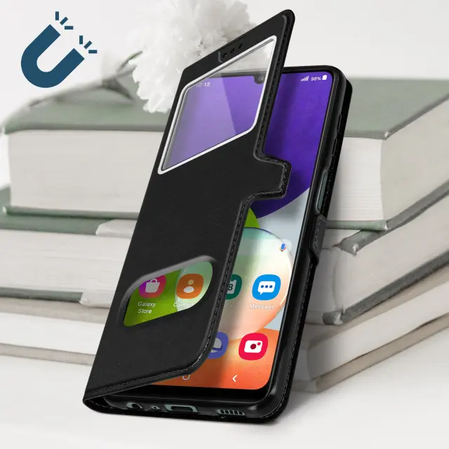 Ovitek posebej oblikovan za Samsung Galaxy A22. Prikazno okno za preverjanje ure in vaših obvestil. Funkcija hitre sprostitve na loputi. Funkcija vodoravnega stojala za gledanje videoposnetkov v ležeči obliki.