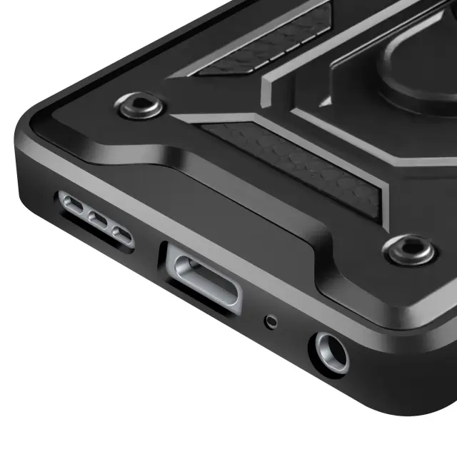 Okrepljena zaščita pred udarci in padci s certifikatom MIL-STD-810G. Drsni pokrov kamere za zaščito objektivov pred praskami. Vgrajen vrtljiv obroč za trden oprijem in praktično držalo za videoposnetke. Zadnja kovinska plošča je združljiva z magnetnim nosilcem za avto.