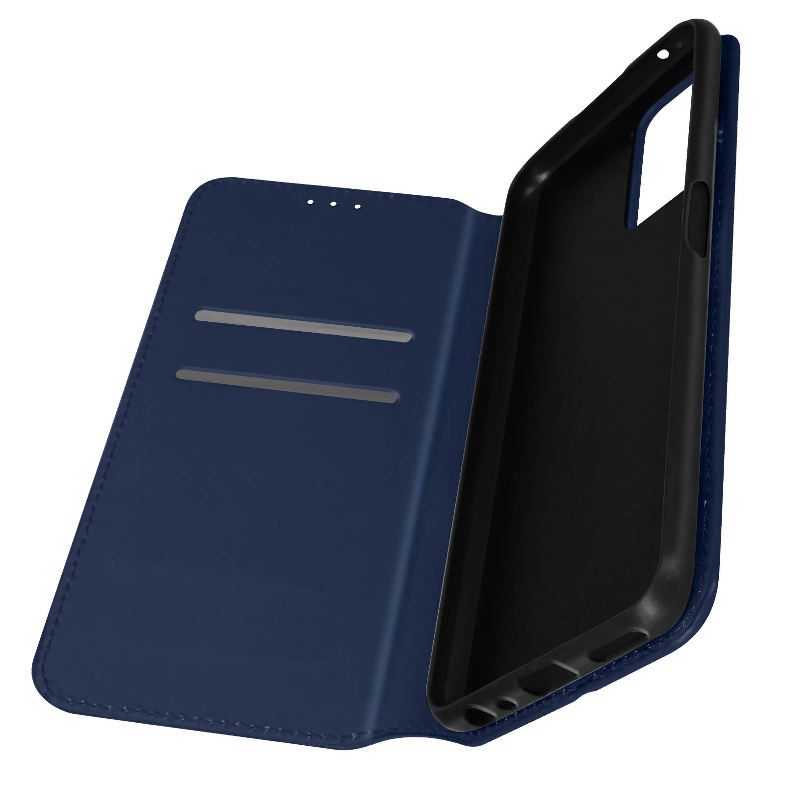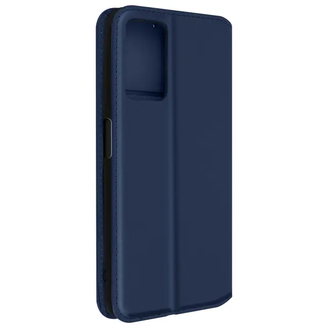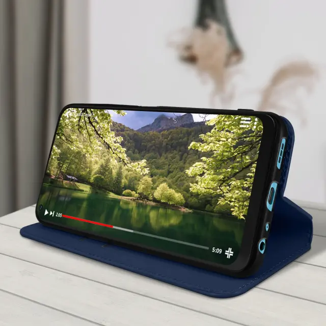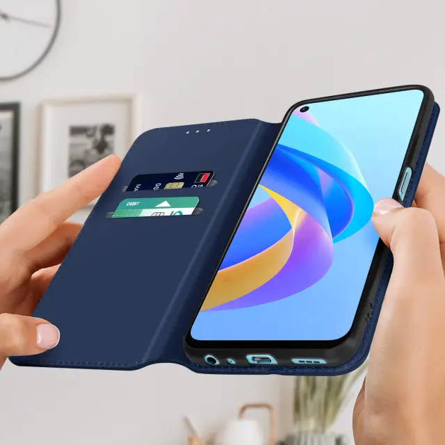 Ovitek Oppo A76, A96 in Realme 9i polnocno moder. Ta etui ima reže za kartice v preklopni podlogi in trdno, prožno silikonsko gelno ohišje. Deluje tudi kot vodoravna podpora za ogled vaših videoposnetkov.
