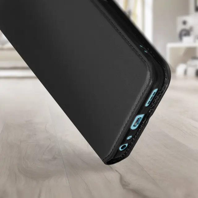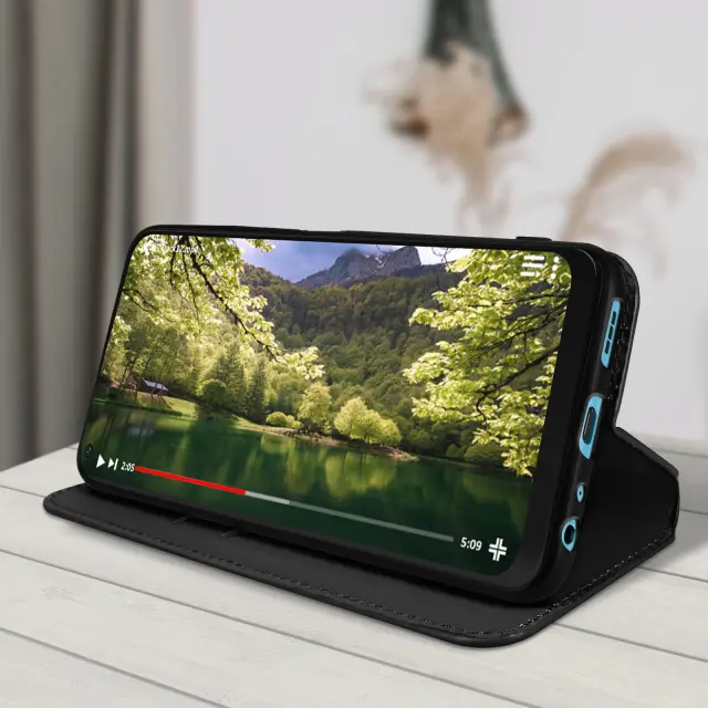 Ovitek Oppo A76, A96 in Realme 9i crn. Ta etui ima reže za kartice v preklopni podlogi in trdno, prožno silikonsko gelno ohišje. Deluje tudi kot vodoravna podpora za ogled vaših videoposnetkov.