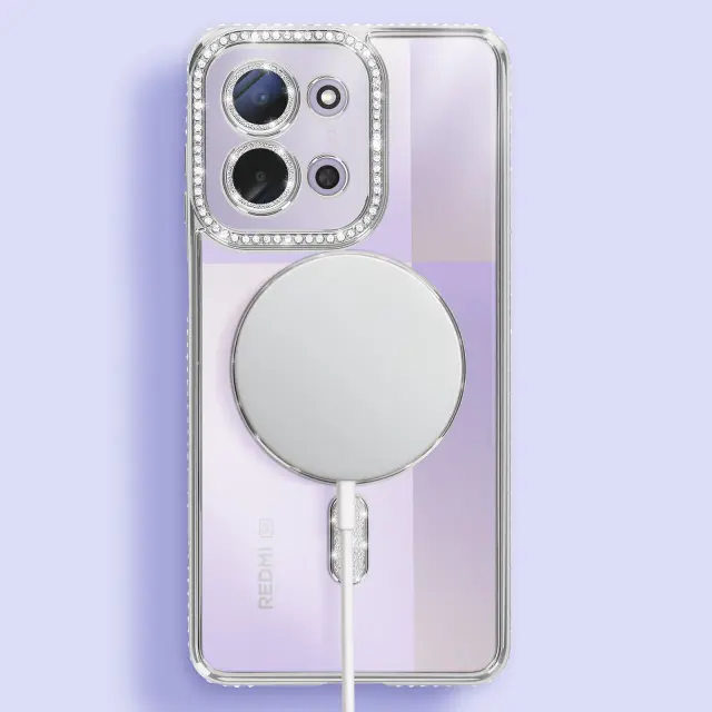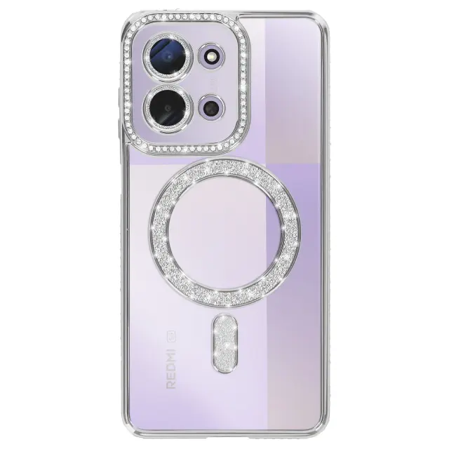 Ovitek za Redmi 15C, združljiv z MagSafe, z obrobo iz okrasnih kamnov, Srebrna