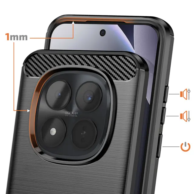To črno ohišje za telefon Redmi Note 15 Pro Plus združuje zasnovo z ogljikovim učinkom in elegantno brušeno teksturo.. Mehka silikonska zasnova absorbira udarce in zagotavlja učinkovito zaščito pred praskami. Dvignjeni robovi varujejo zaslon in fotografsko enoto v primeru padca. Mat zaključek zmanjšuje količino prstnih odtisov in ohranja čist videz..