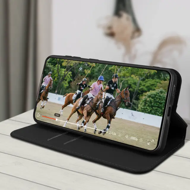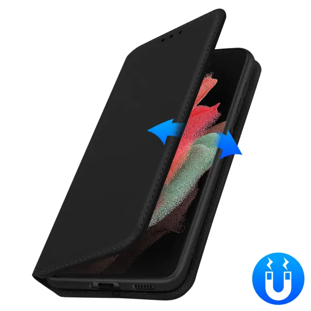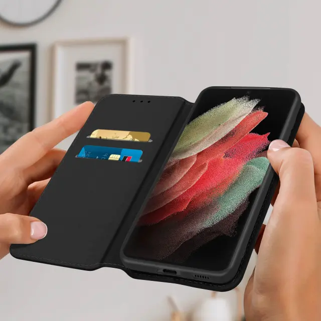 Celoten zaščitni ovitek posebej izdelan za vaš Samsung Galaxy S21 Ultra. Učinkovito ščiti vaš pametni telefon pred vsakodnevnimi udarci in praskami. Izkoristite namensko shrambo, ki je vgrajena v zavihek, da vstavite svoje kartice. Funkcija vodoravnega stojala za udobno uživanje v fotografijah in videoposnetkih.