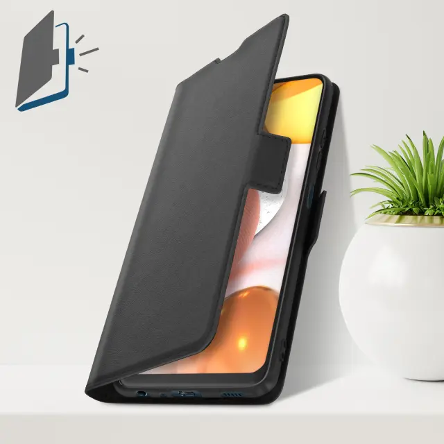 Ovitek za Samsung Galaxy A32 5G crn. Popolnoma šciti vaš mobilni telefon pred vsakodnevnimi udarci in praskami. Zašcita z zavihkom za držalo kartice in funkcijo video stojala. Ta etui ima dvojni magnetni jezicek.