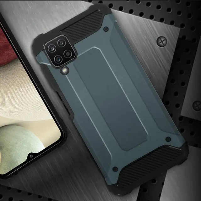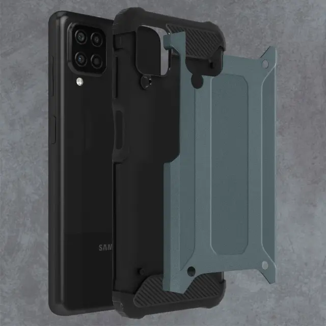 Zaščitna torbica posebej oblikovana za Samsung Galaxy A12. Dvomaterial, zunanja prevleka iz polikarbonata in notranjost iz silikonskega gela. Ta lupina je odporna na udarce in je odporna na padce z višine največ 1,80 metra. Ojačani koti za optimalno zaščito v vseh okoliščinah.