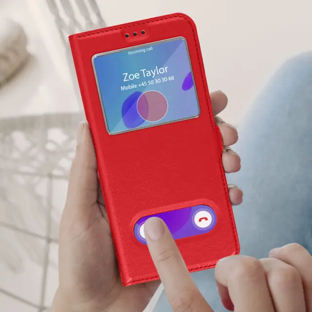Samsung Galaxy S22 Plus rdeca okenska torbica za zašcito mobilnega telefona. Ta prevleka vam omogoca, da ostanete na zaslonu in sprejemate klice zahvaljujoc dvema vgrajenima okencema. Vgrajena zašcita s funkcijo video podpore.