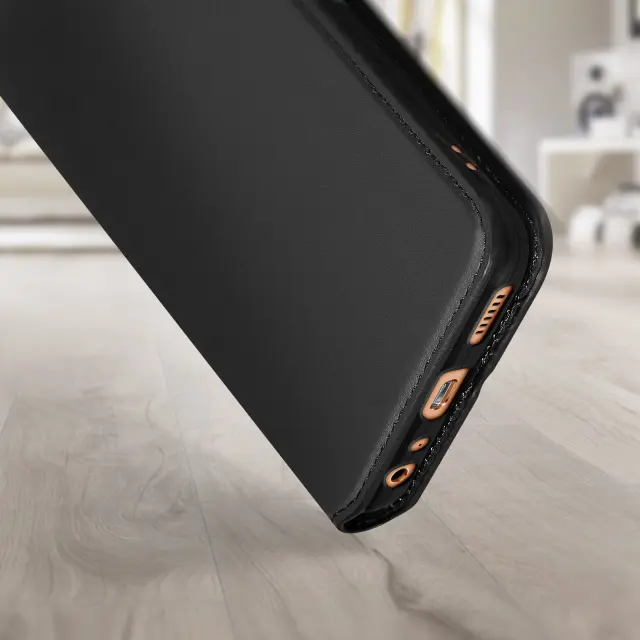 Crn ovitek za Samsung Galaxy A13. Ta etui ima reže za kartice v preklopni podlogi in trdno, prožno silikonsko gelno ohišje. Deluje tudi kot vodoravna podpora za ogled vaših videoposnetkov.