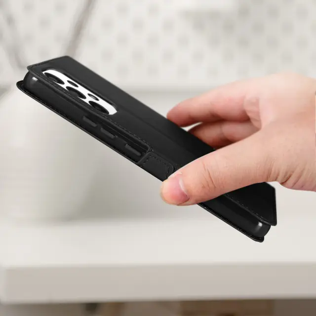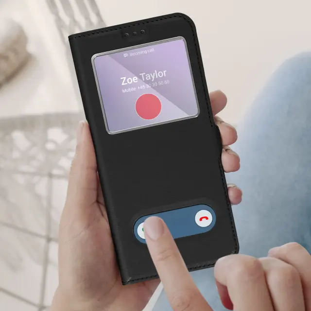 Popolna zaščitna torbica za vaš Samsung Galaxy A53 5G. Zaključek iz umetnega usnja z notranjimi in zunanjimi vidnimi šivi. Pregledno okno za ogled vaših obvestil kadar koli. Odprtina na spodnjem delu etuija za sprejem telefonskih klicev.