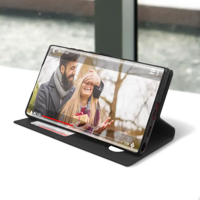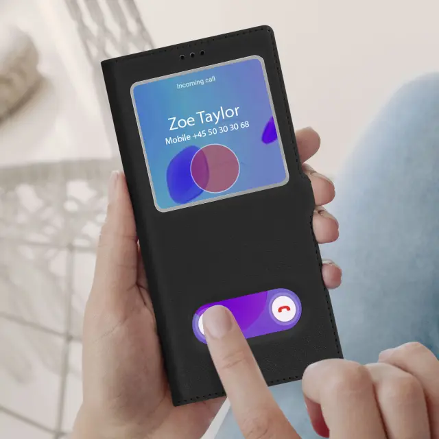 Samsung Galaxy S22 Ultra crna okenska torbica za zašcito mobilnega telefona. Ta prevleka vam omogoca, da ostanete na zaslonu in sprejemate klice zahvaljujoc dvema vgrajenima okencema. Vgrajena zašcita s funkcijo video podpore.