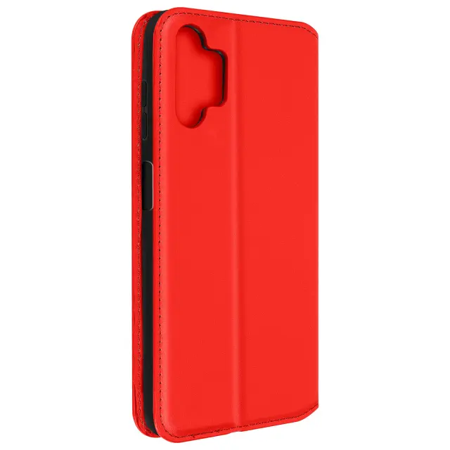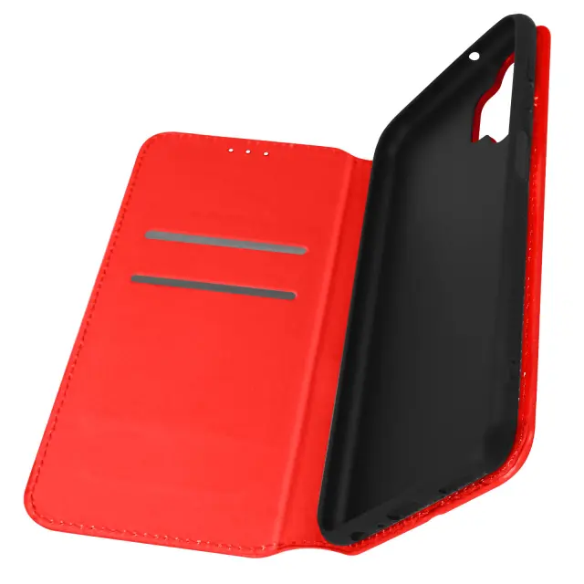 Rdec ovitek za Samsung Galaxy A13. Ta etui ima reže za kartice v preklopni podlogi in trdno, prožno silikonsko gelno ohišje. Deluje tudi kot vodoravna podpora za ogled vaših videoposnetkov.