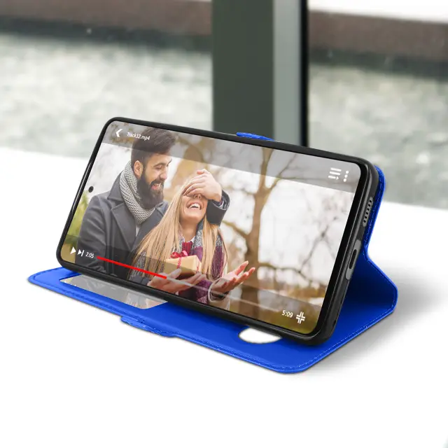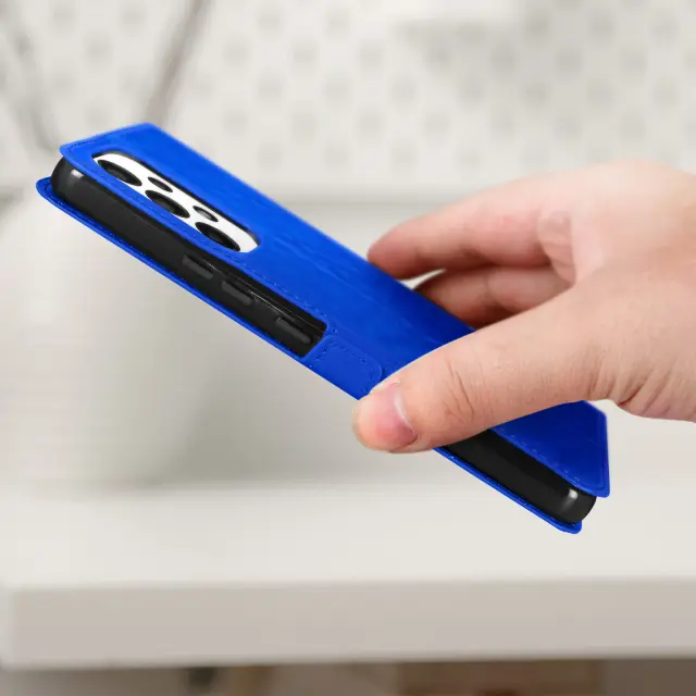 Samsung Galaxy A53 5G blue window ovitek za zašcito mobilnega telefona. Ta prevleka vam omogoca, da ostanete na zaslonu in sprejemate klice zahvaljujoc dvema vgrajenima okencema. Vgrajena zašcita s funkcijo video podpore.