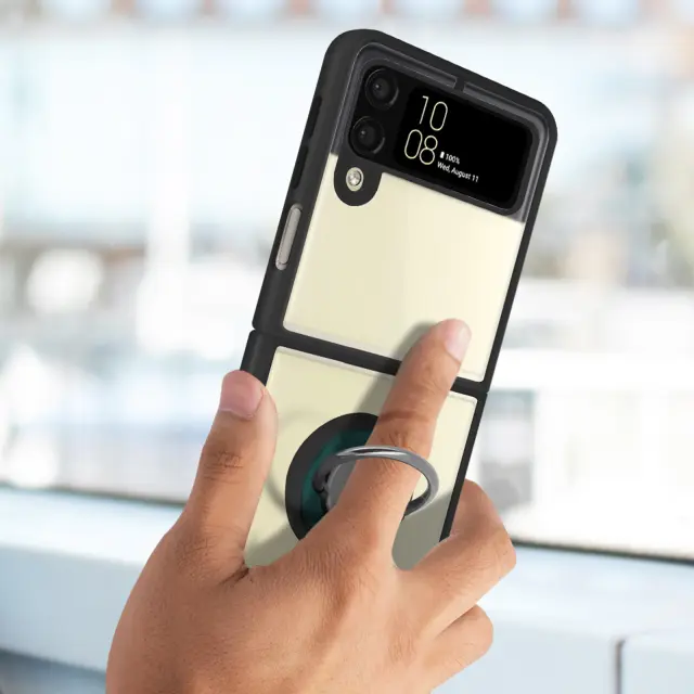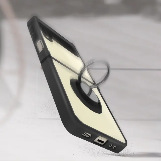 Črna zaščitna torbica z obročem, posebej oblikovana za Samsung Galaxy Z Flip 3. Zadnji obroč za varno uporabo v vseh okoliščinah. Obrnite prstan v vodoravno ali navpično stojalo in uživajte v svojem pametnem telefonu. Ščiti vaš pametni telefon pred vsakodnevnimi udarci, padci in praskami.