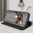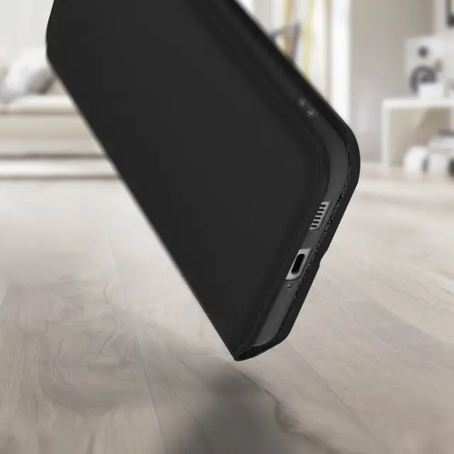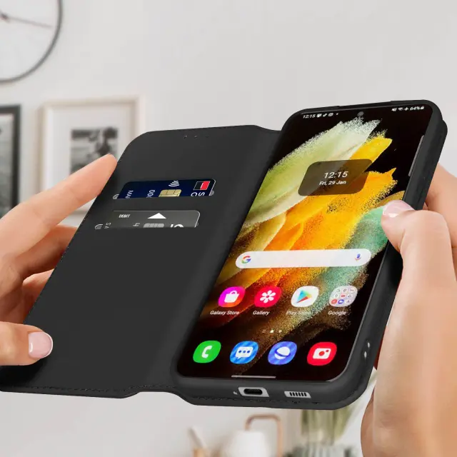 Crn ovitek za Samsung Galaxy S22. Ta etui ima reže za kartice v preklopni podlogi in trdno, prožno silikonsko gelno ohišje. Deluje tudi kot vodoravna podpora za ogled vaših videoposnetkov.