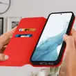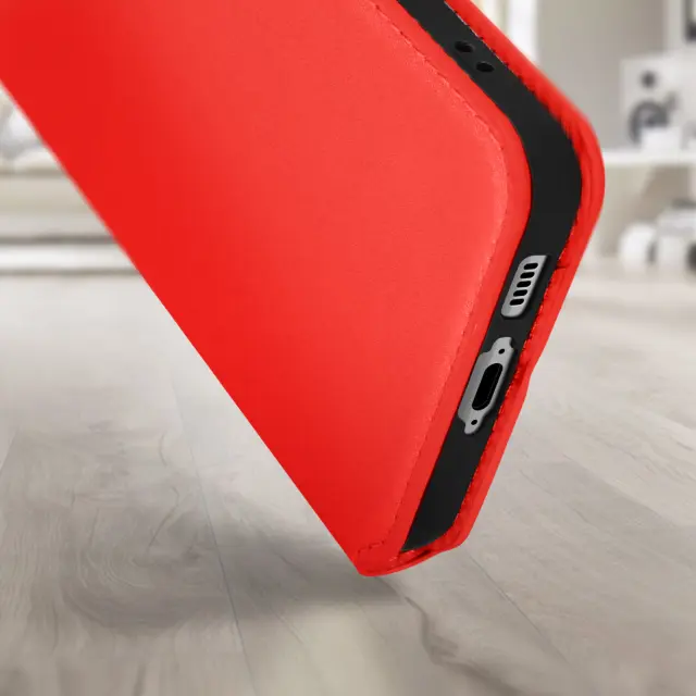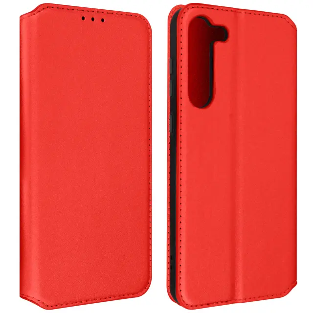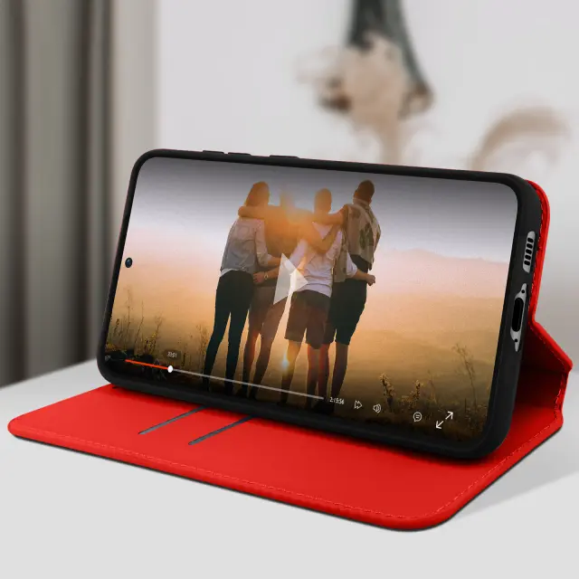 Ovitek za Samsung Galaxy S23 Plus rdec. Ta etui ima reže za kartice v preklopni podlogi in trdno, prožno silikonsko gelno ohišje. Deluje tudi kot vodoravna podpora za ogled vaših videoposnetkov.