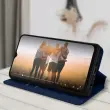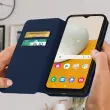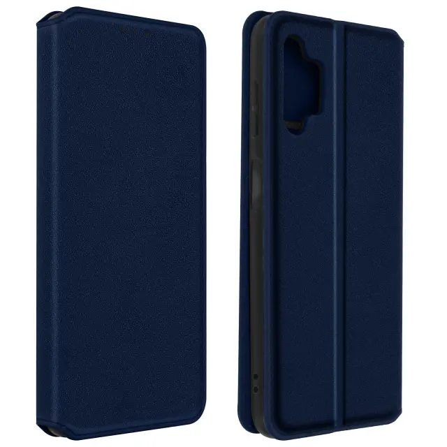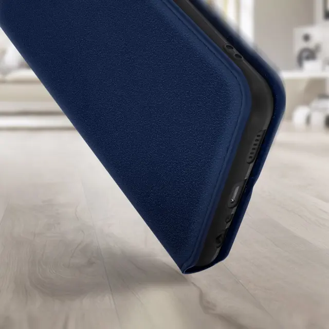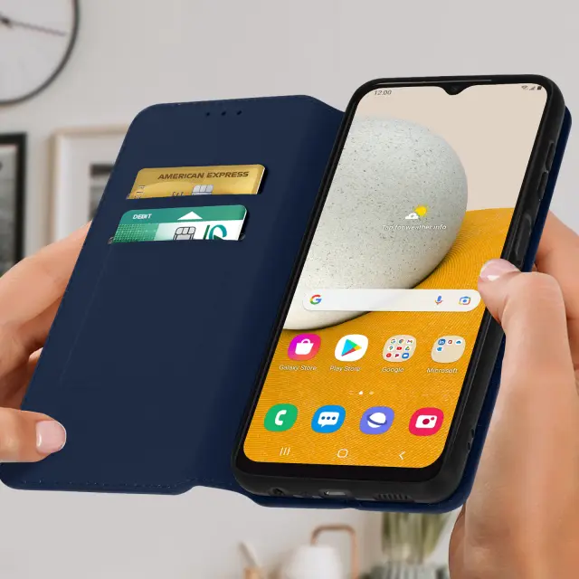 Ovitek Samsung Galaxy A13 5G in A04s moder. Ta etui ima reže za kartice v preklopni podlogi in trdno, prožno silikonsko gelno ohišje. Deluje tudi kot vodoravna podpora za ogled vaših videoposnetkov.