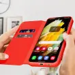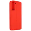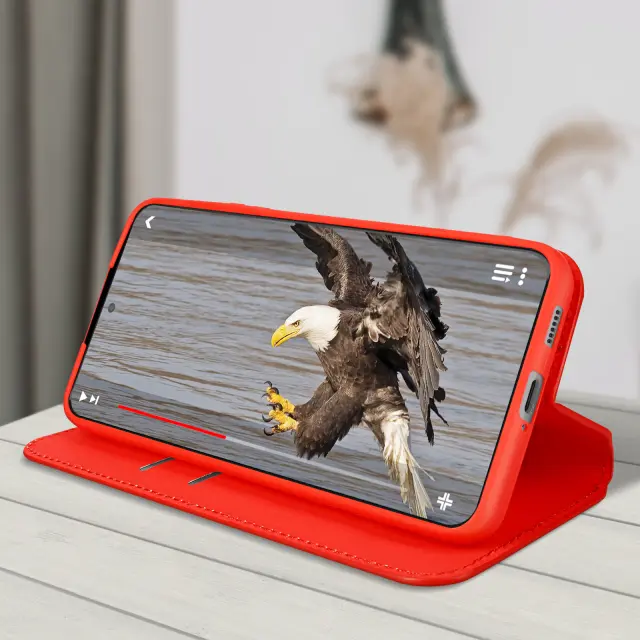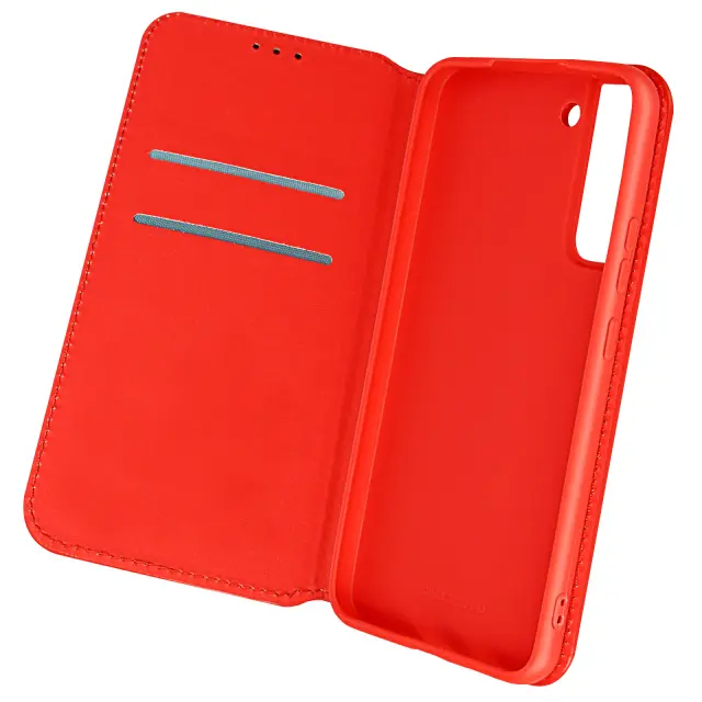 Ovitek za Samsung Galaxy S22 rdec. Ta etui ima reže za kartice v preklopni podlogi in trdno, prožno silikonsko gelno ohišje. Deluje tudi kot vodoravna podpora za ogled vaših videoposnetkov.