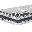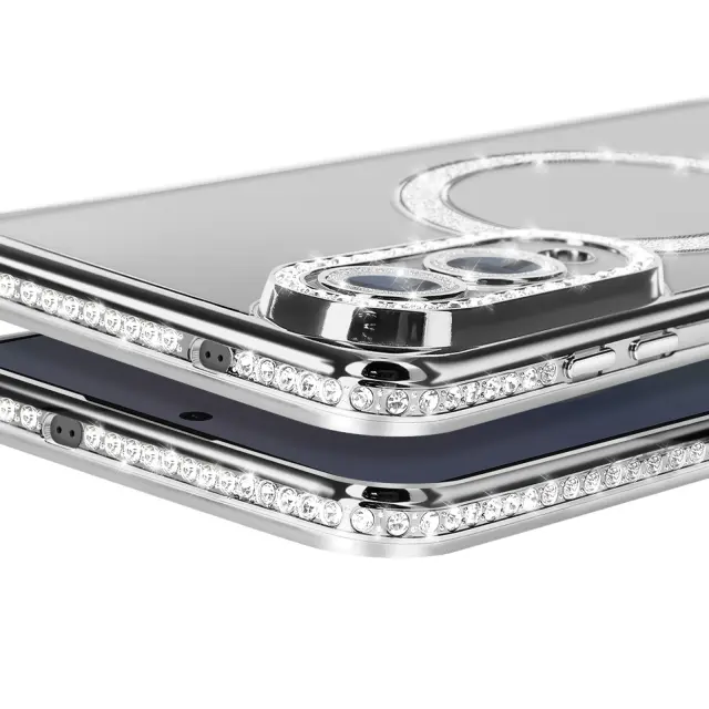 Prefinjen obris s kristalčki za elegantno, sijočo lupino. Združljivost s sistemom MagSafe zaradi vgrajenega magnetnega obroča. Zanesljiva zaščita pred praskami, udarci in manjšimi padci. Ojačan blok kamere za optimalno zaščito objektiva.