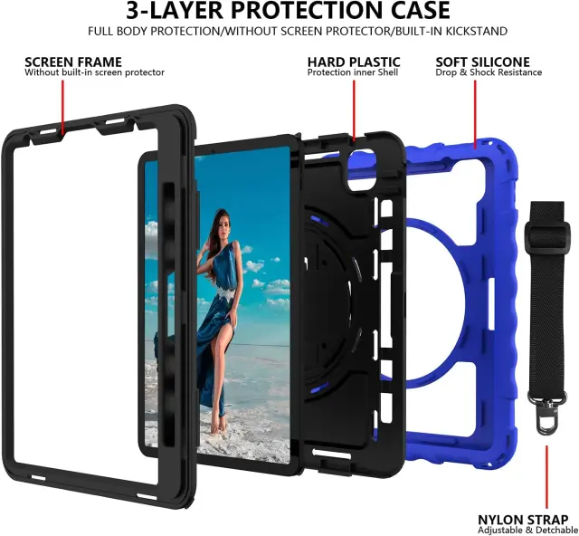 Naš trpežen ovitek predstavlja odlično izbiro za vse, ki iščejo brezkompromisno varnost in funkcionalnost v enem izdelku. Trislojna konstrukcija v kombinaciji z ergonomskim ročajem in naramnim pasom zagotavlja udobno uporabo v vseh pogojih, od pisarne do pohodništva. Izberite ta ovitek in poskrbite za dolgotrajno zaščito svoje naprave, medtem ko ohranjate njen sodoben in eleganten videz v modri barvi.