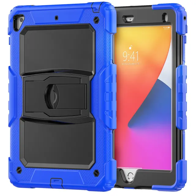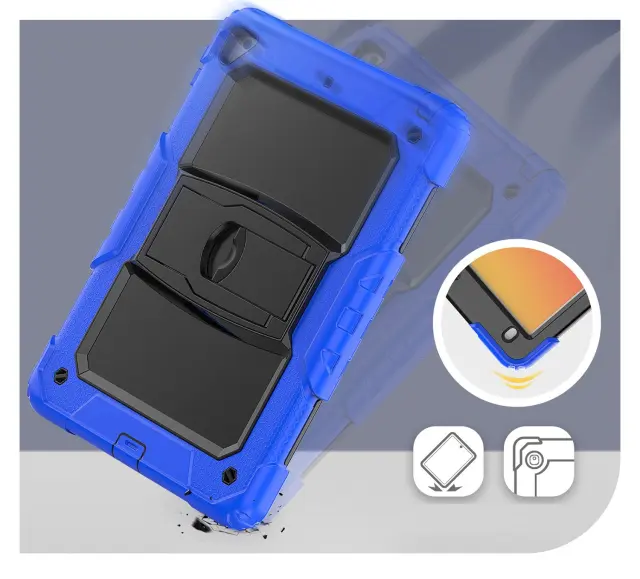 Ta trpežni ovitek je zasnovan za zagotavljanje celovite zaščite vaše tablične naprave med vsakodnevno uporabo. Sestavljen je iz treh plasti, ki vključujejo trdno plastično ohišje PC in mehko silikonsko hrbtišče, kar učinkovito ščiti napravo pred praskami, udarci in vibracijami. Izdelek je opremljen z vgrajenim zložljivim stojalom in nastavljivim naramnim trakom, kar omogoča večjo prilagodljivost in udobje pri delu ali zabavi. Natančno izdelani izrezi zagotavljajo popolno prilagajanje vsem vratom in gumbom, hkrati pa nudijo enostaven dostop do vseh funkcij naprave.