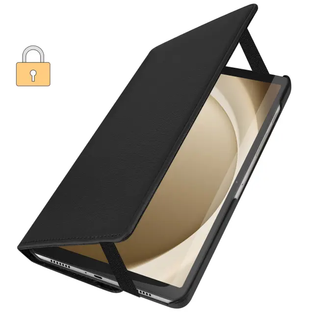 Ovitek za Samsung Galaxy Tab A9 Plus, elegantno crno umetno usnje. Preklopni ovitek za Galaxy Tab A9 Plus. Popolna zašcita, elasticno zapiranje. Samsung Tab A9 Plus Protection z vrtljivim stojalom Portret in ležeci nacin za prilagodljivo gledanje.
