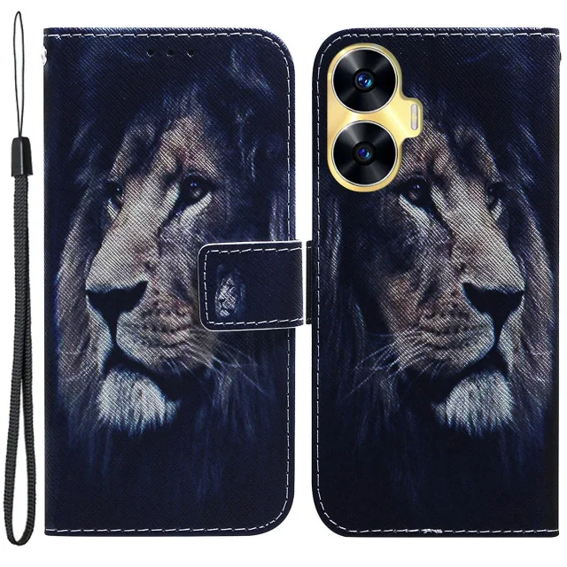 Ovitek za telefon proti padcem za Realme C55 s tiskanjem vzorcev, PU usnjeno stojalo za denarnico s trakom