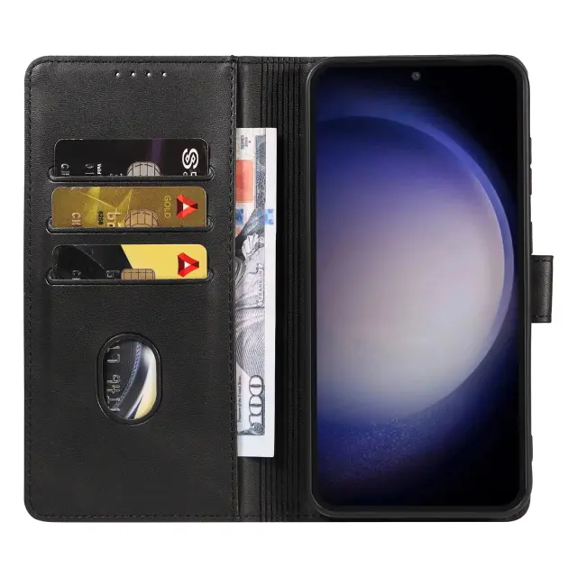 Celovita zaščita: ta ovitek za telefon Samsung Galaxy Series je izdelan iz kombinacije PU usnja in materialov TPU, ki zagotavlja robustno zaščito pred nenamernimi padci, praskami in vsakodnevno obrabo. Dvignjeni robovi okoli zaslona in kamere zagotavljajo izboljšano zaščito pred površinskimi udarci.