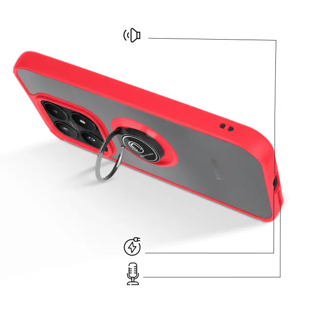 Ohišje je ojačano na vseh štirih vogalih, da bolje absorbira udarce v primeru nenamernega padca.. 360° vrtljiv obroč omogoča uporabo telefona v video ali navigacijskem načinu brez dodatnega stojala. Vključuje magnetno ploščo, ki je združljiva z nosilci za avto, ne da bi potrebovali dodatno opremo. Matirana površina je odporna na praske, prstne odtise in madeže, hkrati pa ohranja eleganten slog..