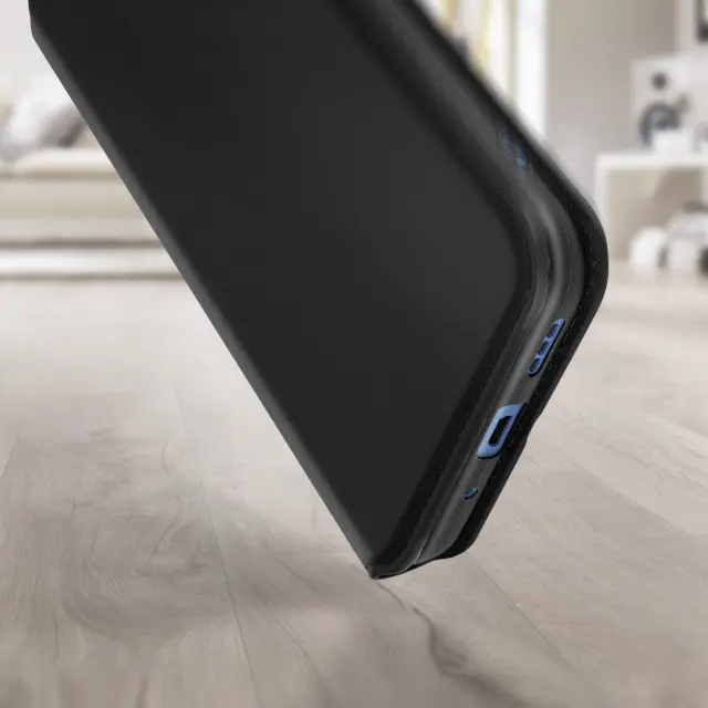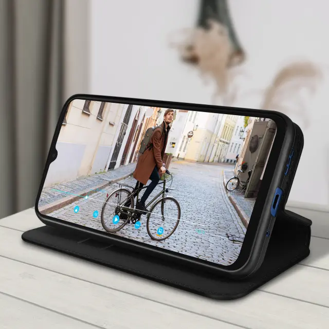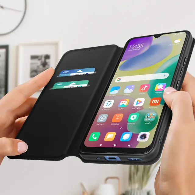 Ovitek Xiaomi Redmi 10A crn. Ta etui ima reže za kartice v preklopni podlogi in trdno, prožno silikonsko gelno ohišje. Deluje tudi kot vodoravna podpora za ogled vaših videoposnetkov.