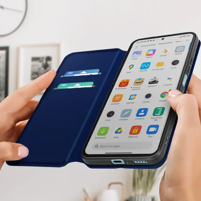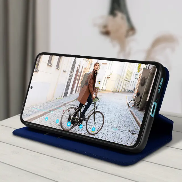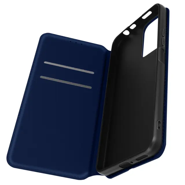 Ovitek Xiaomi Redmi Note 11 Pro Plus polnocno moder. Ta etui ima reže za kartice v preklopni podlogi in trdno, prožno silikonsko gelno ohišje. Deluje tudi kot vodoravna podpora za ogled vaših videoposnetkov.