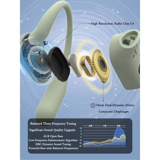 Vrhunska kakovost zvoka: Doživite neprimerljivo zvočno natančnost z dekodiranjem zvoka visoke ločljivosti AAC/SBC, ki zagotavlja bogat in podroben zvok. 360° panoramski zvočni učinek vas potopi v 3D surround HIFI zvočno polje, ki oživi vašo glasbo in klice. 18 mm dvoslojni dinamični gonilnik s kompozitno membrano iz visokega polimera zagotavlja kristalno čiste visoke tone in globoke, resonančne nizke tone. Te slušalke so kot nalašč za avdiofile in vse, ki cenijo izjemno kakovost zvoka, ne glede na to, ali poslušate glasbo, podcaste ali opravljate klice. Uživajte v resnično poglobljeni zvočni izkušnji s temi naprednimi slušalkami z zračno prevodnostjo.