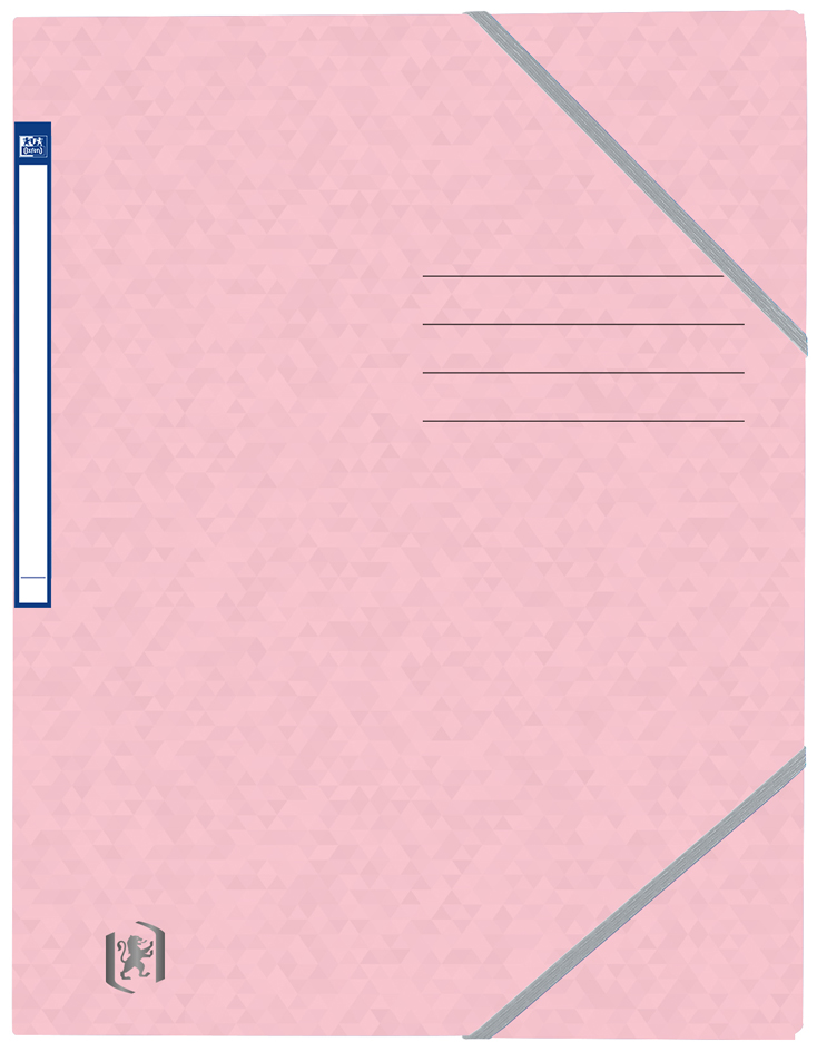 390 gsm karton, s tiskanim poljem za nalepke in nalepljeno nalepko na hrbtu, elastika z ravnim kotom, visoka vzdržljivost 3 preklopni zavihki (400116353) Pomembni podatki: Izvedba: karton Format: A4 Barva: pastelno roza Širina embalaže v mm: 240 pak.