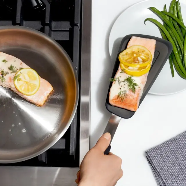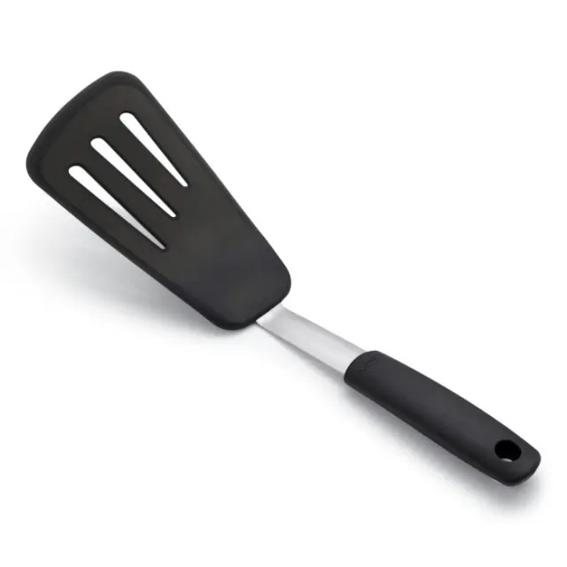 Discover the OXO Good Grips Large Black Silicone Spatula, designed for effortless cooking and baking. This versatile spatula is perfect for folding omelettes, flipping pancakes, and serving your favorite dishes. Crafted from high-temperature resistant silicone, it won't scratch your cookware, ensuring a long-lasting performance. The stainless steel core adds strength and durability, while its sleek black design complements any kitchen decor. Plus, it's dishwasher safe for easy cleanup. Upgrade your kitchen tools with this essential spatula from OXO.