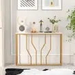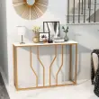 Ta konzolna mizica je idealna izbira, ne glede na to, ali potrebujete prostor za shranjevanje ali razstavni prostor. Struktura iz belega umetnega marmorja in geometrijski kovinski okvir zlate barve izžarevata visoko kakovost in eleganco. Široka mizna plošča zagotavlja dovolj prostora za shranjevanje in razstavljanje vsakdanjih predmetov in okrasnih predmetov. Kombinacija trpežne plošče in trdnih kovinskih cevi zagotavlja boljšo vzdržljivost, daljšo življenjsko dobo in večjo stabilnost. Poleg tega lahko z napravo proti prevračanju varno pritrdite vhodno mizo in preprečite, da bi se prevrnila. Na splošno je ta elegantna konzolna mizica odličen dodatek za dnevne sobe, vhodne prostore itd.