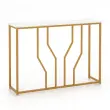 Luksuzni in sodobni slog Površina mize je okrašena z belo teksturo iz umetnega marmorja in je dokaz izvrstne izdelave. Ta sodobna konzolna mizica z geometrijskim kovinskim okvirjem zlate barve navdušuje z elegantnim in očarljivim videzom.