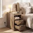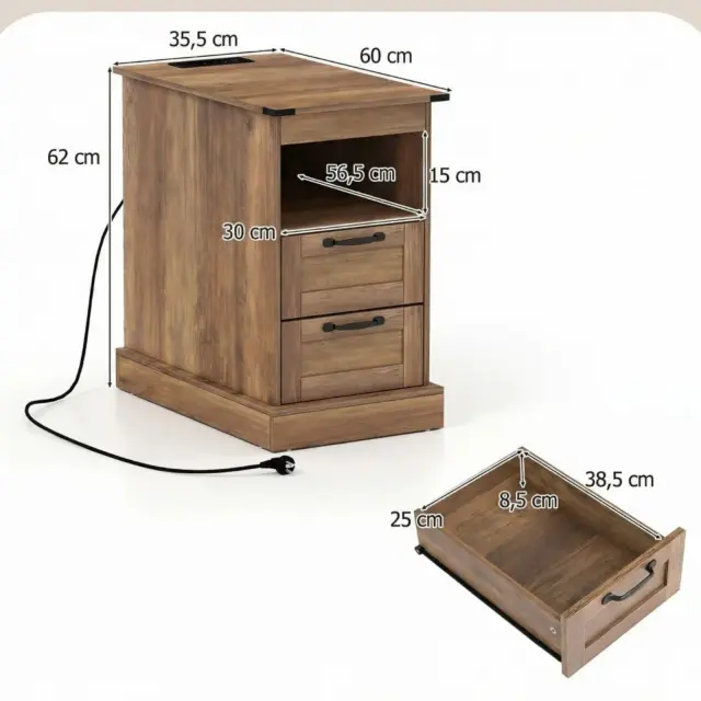 Ta nočna omarica združuje rustikalni slog s praktično funkcionalnostjo in ima teksturirano leseno površino, ki ustvarja topel ambient. Ima prostorno zgornjo polico, odprt predal, 2 izvlečna predala in skrito zadnjo polico, kar zagotavlja dovolj prostora za shranjevanje vsakodnevnih potrebščin. Opremljen je z dvema varnostnima vtičnicama, priključkom USB in priključkom tipa C ter kabelsko vponko, zato omogoča praktično polnjenje in skrbi za urejenost kablov. Robustna nočna omarica z debelim podnožjem in nedrsečimi nogicami zagotavlja stabilnost. Vsestranski kos pohištva je idealen kot nočna ali stranska omarica ter je eleganten in zanesljiv dodatek za spalnice, dnevne sobe, predsobe ali študentske domove.
