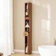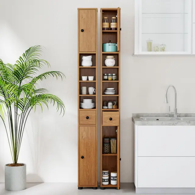Ta ozka omarica za kopalnico je kot nalašč za organizacijo brisač, toaletnih pripomočkov, knjig, kozmetike in toaletnega papirja, saj ima dve omarici s tristopenjsko nastavitvijo, odprto polico s sedemstopenjsko nastavitvijo in predal.